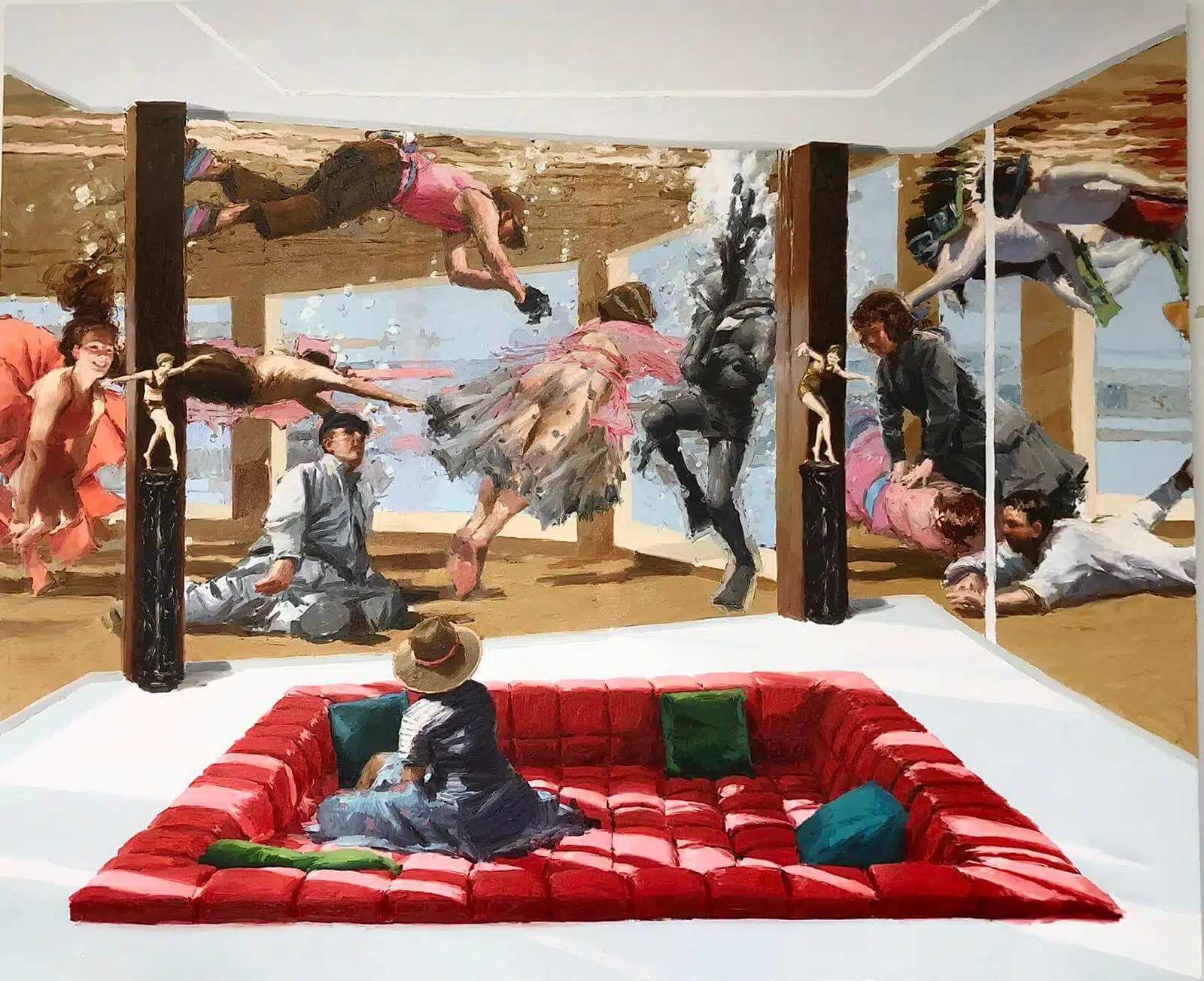 Today, Julio Larraz paintings are recognized for their technical precision and their enigmatic atmosphere. His compositions often depict maritime scenes, imagined architectures, and solitary figures suspended within vast landscapes. Through oil painting, Larraz builds symbolic worlds that reflect on themes such as exile, power, and solitude.